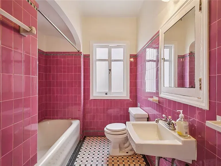Recent updates include wood-style flooring, fresh paint, and a refreshed kitchen with shaker-style cabinetry, updated countertops, a country style sink, tile backsplash, and updated appliances. The bathroom retains its vintage charm with original tilework, a tub/shower combination, and a window for natural light and ventilation.