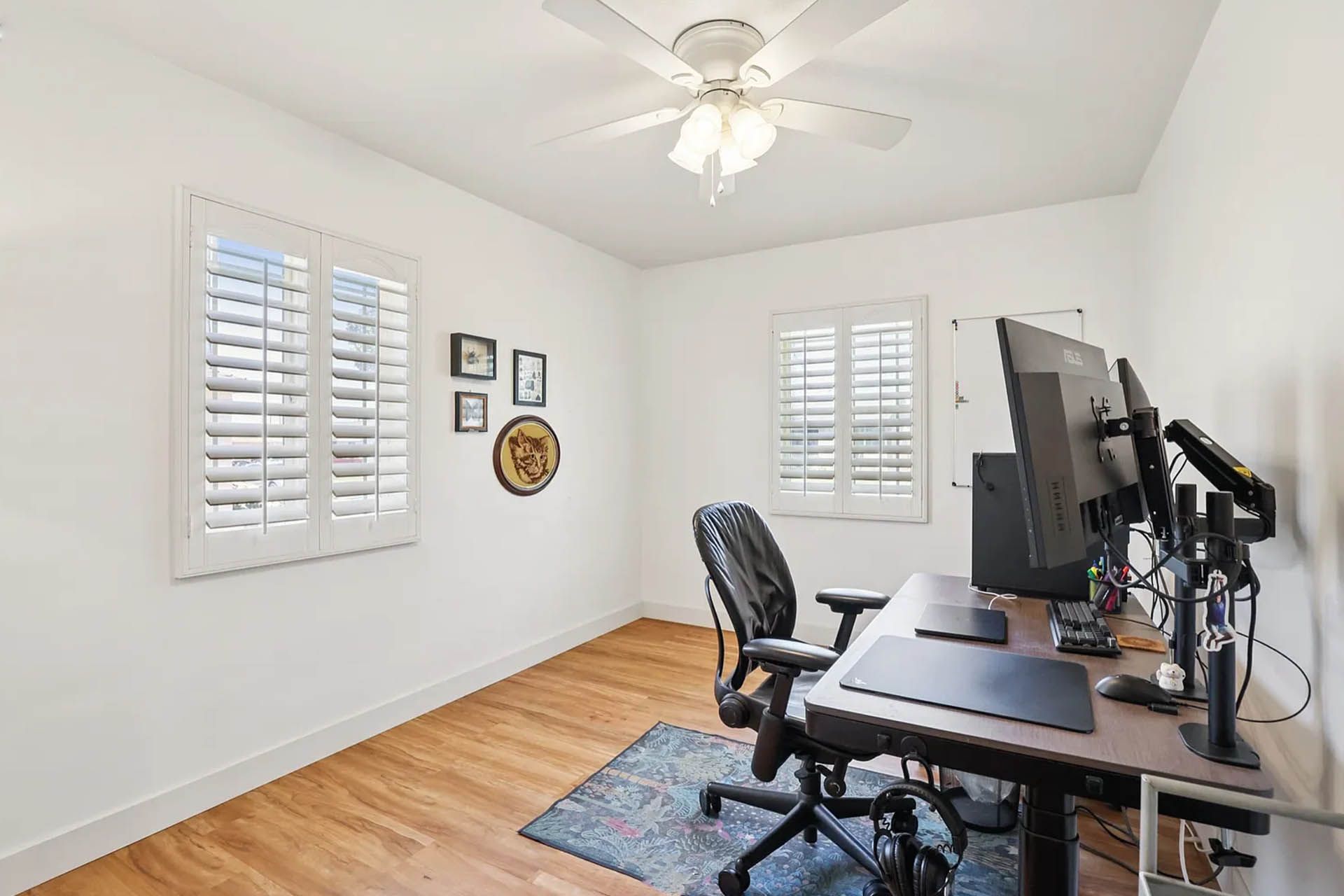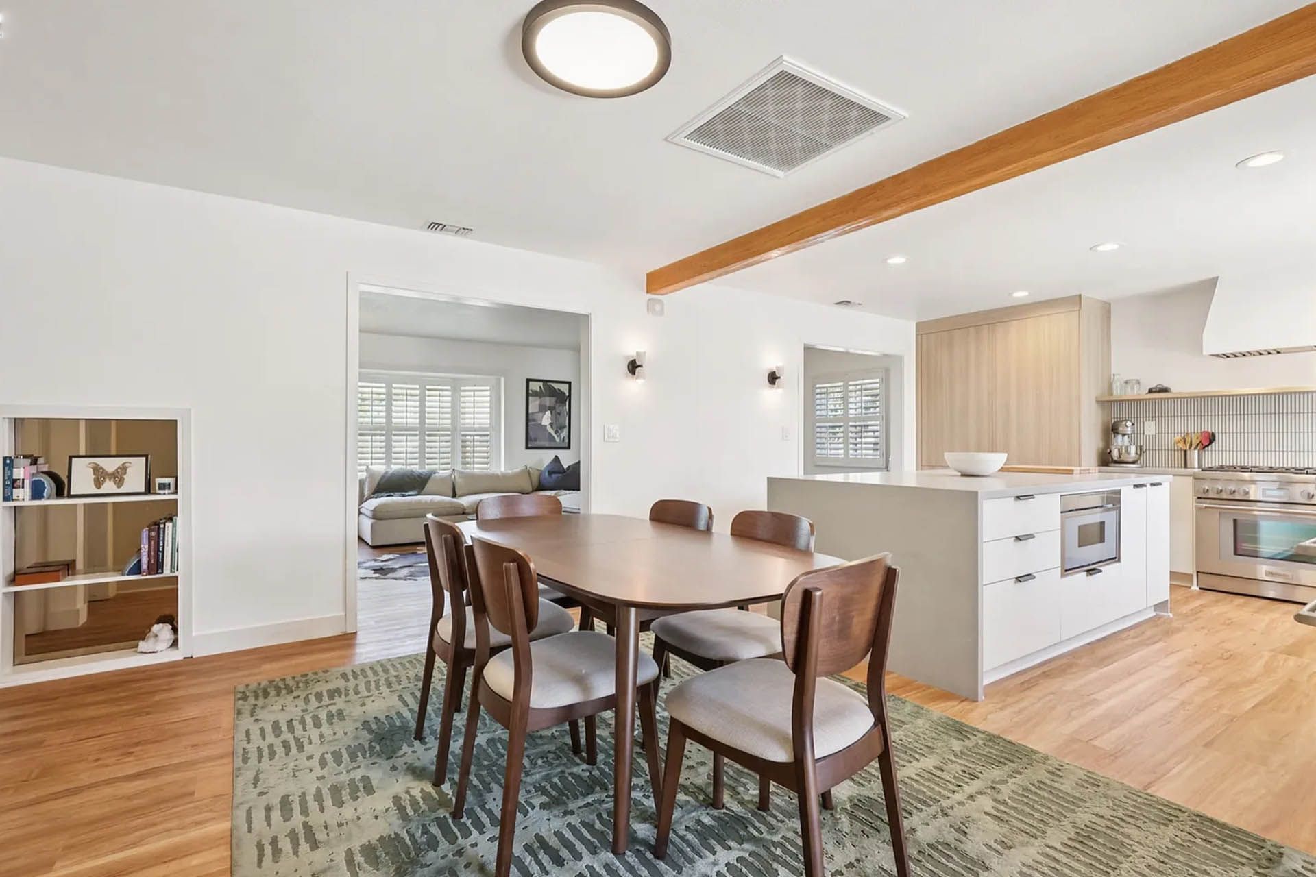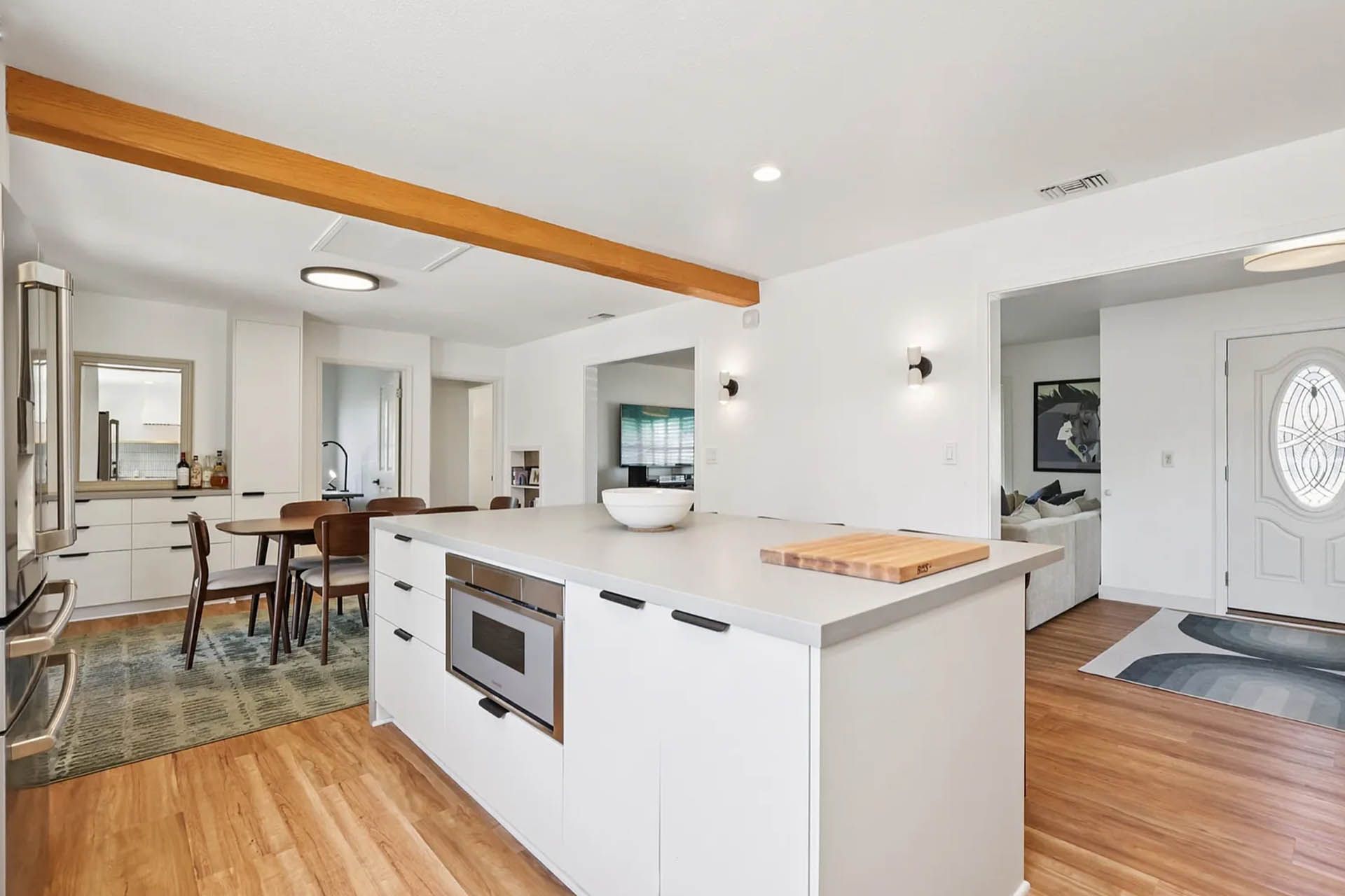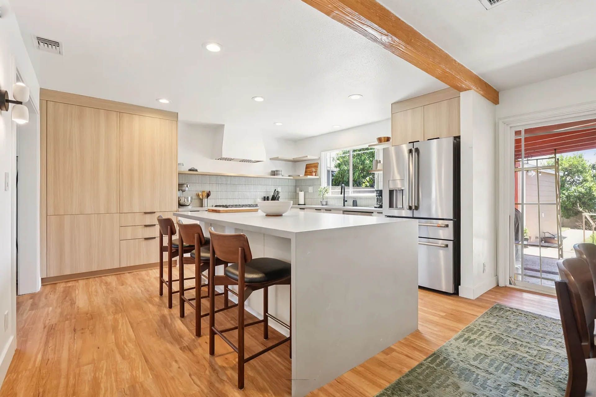 Located in the central heart of the coveted Wrigley Heights neighborhood, welcome home! This meticulously maintained and well upgraded home has been thoughtfully redesigned for comfortable and convenient living. Entering from a brick-accented entry and porch, the foyer and living room provide a spacious area for entertaining, natural light spilling through a charming bay window fitted, like most throughout the home, with custom plantation shutters. Rearward, a centerpiece to the home, is a top-notch chef's kitchen. Fully remodeled, it boasts an expansive stone-topped island, copious amounts of cabinet storage solutions, high-end matching Thermador® appliances, and thoughtful open shelving to display one's finest and interesting pieces of cook and dish ware. The open, airy plan continues to the adjacent dining room, fitted with a sideboard built to match the design of the kitchen, and equipped with a sliding door leading to the rear yard. For sleeping quarters, two bedrooms can be found at the front and middle of the home, while the primary suite is insulated from these first bedrooms with the hall bathroom between. All of these rooms are fitted with plenty of closet space, expanded from the original 1940's design. The rear yard includes such features as a covered carport behind gates, a covered patio area, 2-car detached garage, and, perhaps most importantly, a green lawn shaded by a beautiful, mature and producing avocado tree. Home system upgrades include: energy-efficient heat pump system, tankless water heater, 200A electrical panel, and dual-pane windows throughout. Do not sit on this opportunity to become part of a wonderful community in a sleepy, lightly-trafficked pocket of Long Beach!